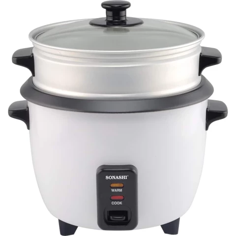 The insulated double-wall construction with a heated lid cooks various types of rice to fluffy perfection.